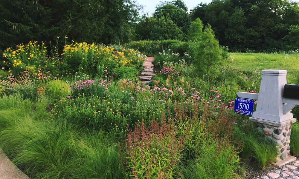 He and his wife, Robbi, transformed a difficult-to-mow site into a colorful array of native plants and grasses that return year-after-year with minimal maintenance. The drifts of flowers attract a bevy of pollinators during the growing season. The dried seed heads and stalks are eye-catching in winter. But they do more than that. “The seeds also feed the birds,” Robbi says. “We have a lot of goldfinches as well as other birds in the winter. The prairie seems to attract more of them.”