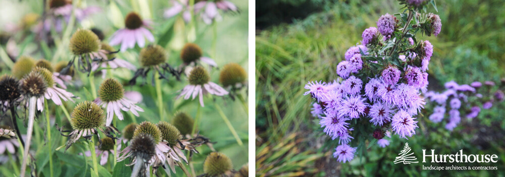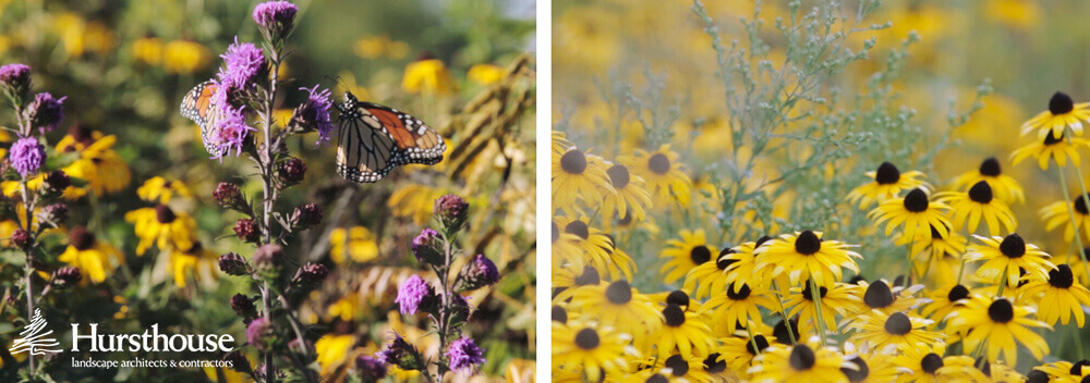 Although the plants look like they’ve could have just popped up on their own, the slope is a carefully designed landscape that allows the plants to flow together. A drift of prairie dropseed with its fine-textured foliage contrasts with the spiky flower stalks of beardtongue, which is a magnet for hummingbirds. Several species of coneflowers bloom from summer into fall when the seeds attract goldfinches.