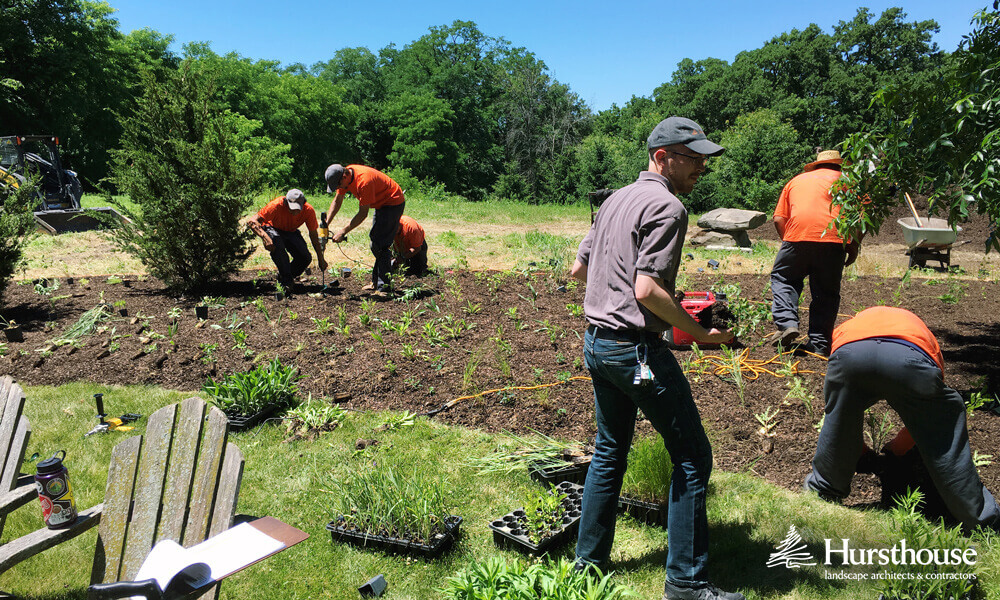 The turf was treated with herbicide and left in place where it would decompose over time. Four inches of special compost was spread over the 6,000-square-foot space. An electric driller was used to make the planting holes, and in the process, mixed some compost into each hole. Next, hundreds of small plant “plugs” were put into place. (Good things come in small packages. The plugs typically hold about two inches of soil mix and a small plant—much smaller than what you would find at a local garden center. In a design like this, using the plugs is cost-effective and the plants can be spaced closer together, which results in more instant gratification.) The planting was completed in late June, 2016.