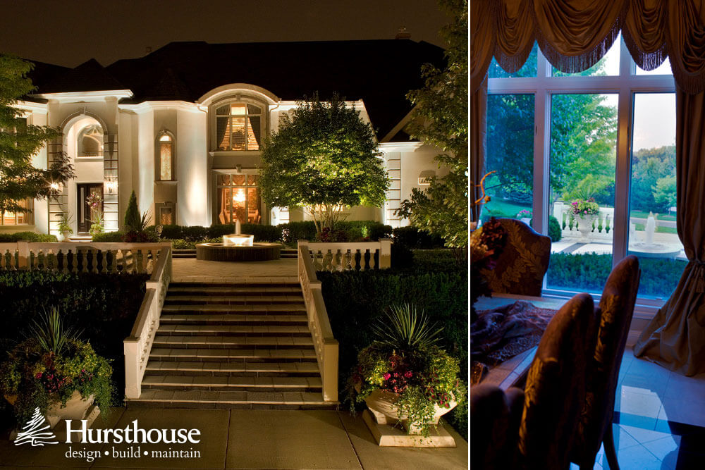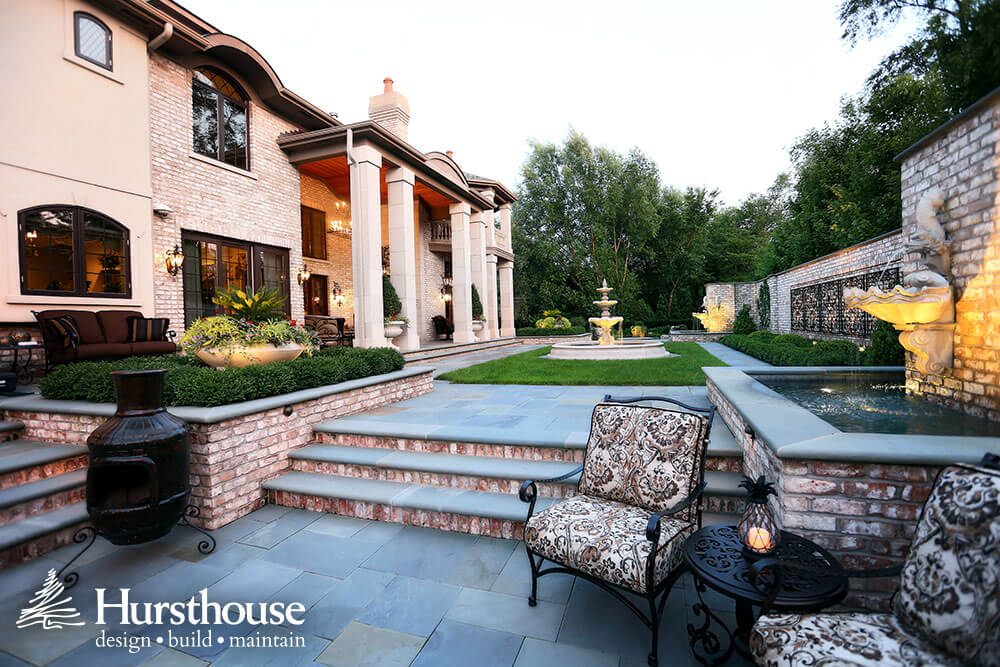 For another project, Hursthouse centered an elegant fountain so it could be enjoyed from the home’s dining room window. “It’s a grand embellishment that projects a fabulous focal point from any angle,” Hursthouse says. The fountain’s submersed lighting creates a special effect after dark. The primary walk is flanked with masonry walls and embellished with cast limestone planters.