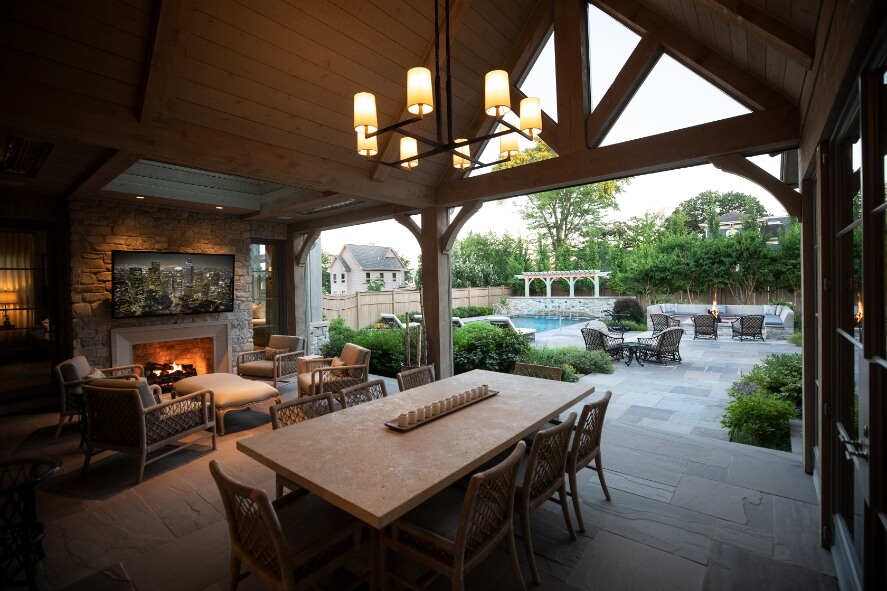 Covered Outdoor Living Room: Extend your entertainment outdoors with this covered lounge area, complete with a fireplace, comfortable seating, and a dining area for guests. Overlooking the pool, this design provides the perfect spot to watch over swimming children or enjoy dinner and drinks—rain or shine.
