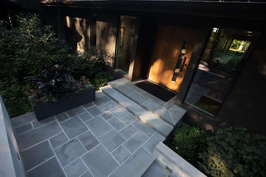 Welcoming Entryway: The front entry is where first impressions are made, and this sleek design featuring bluestone steps and planters filled with seasonal greens creates a welcoming and refined approach for your guests. Ideal for warm welcomes and goodbyes, this landscape feature ensures a lasting impression.