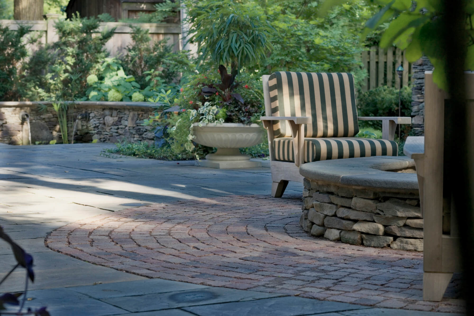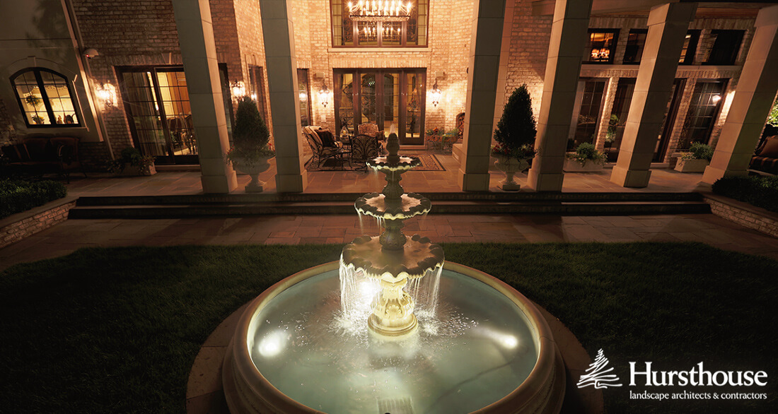 For one very elegant property, we installed brass and copper LED lighting fixtures to enhance the strong formal landscape lines at night. We also submersed lighting into the fountain to create a special effect after dark. Landscaping is an important investment—we want our clients to make the most of their property not just in the summer when they may be entertaining or relaxing, but all year long.